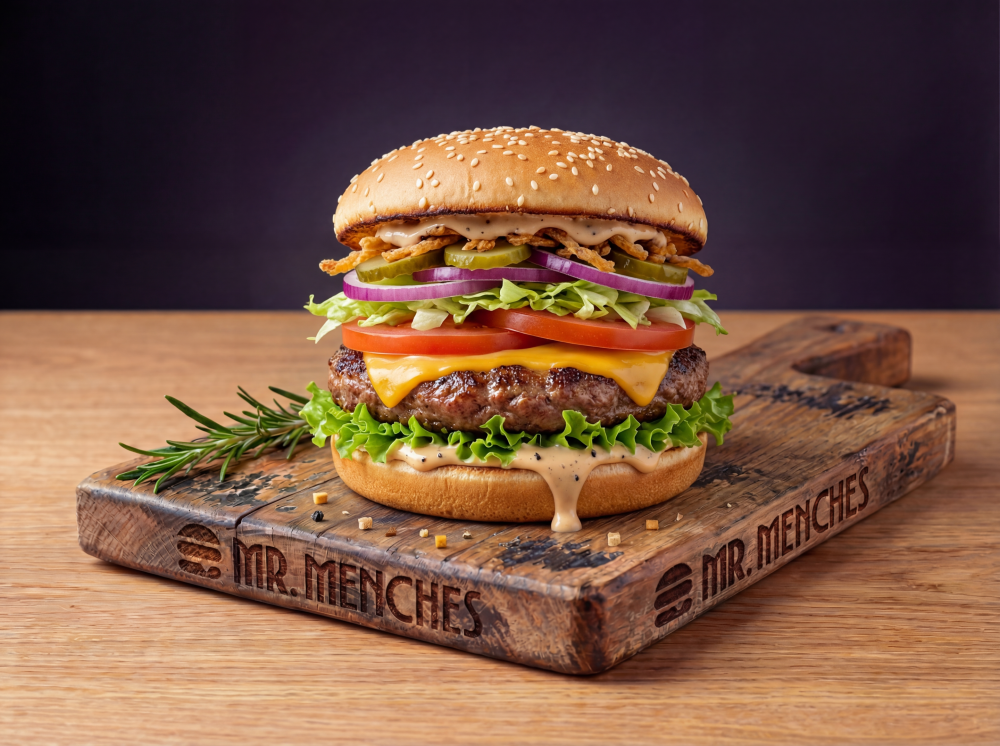 Булочка с кунжутом, котлета из мраморной говядины, красный лук, лук фри, маринованный огурец, помидор, салат айсберг, салат фриллис, сыр чеддер, соус Бургер