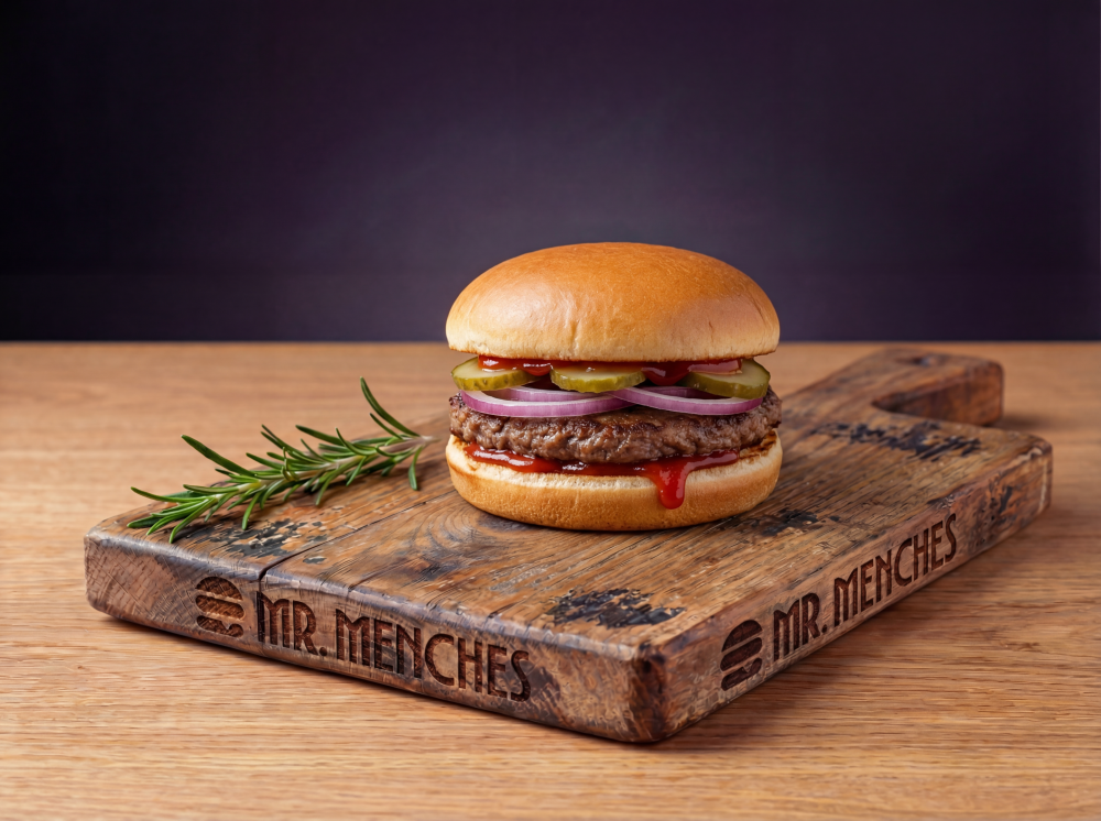 Булочка без кунжута, котлета из говядины, красный лук, маринованный огурец, соус Кетчуп
