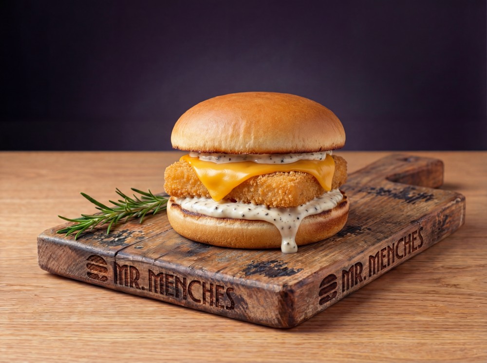 Булочка без кунжута, котлета из рыбы, сыр чеддер, соус Тар тар