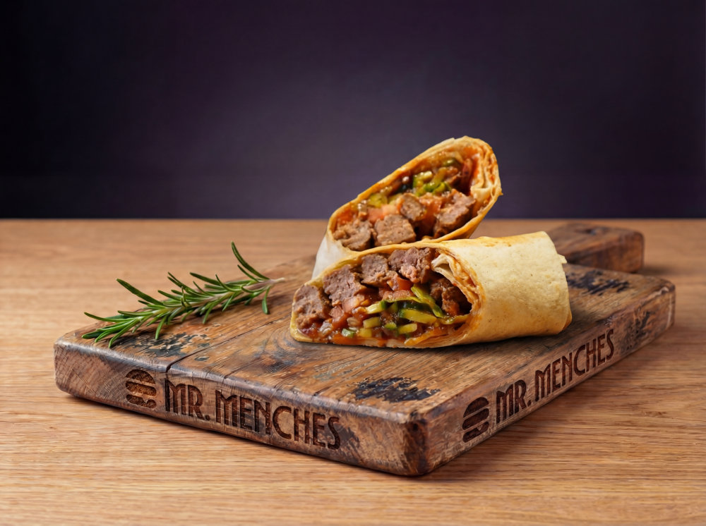 Тортилья, котлета из мраморной говядины, помидор, свежий огурец, красный лук, салат айсберг, соус Сацебели