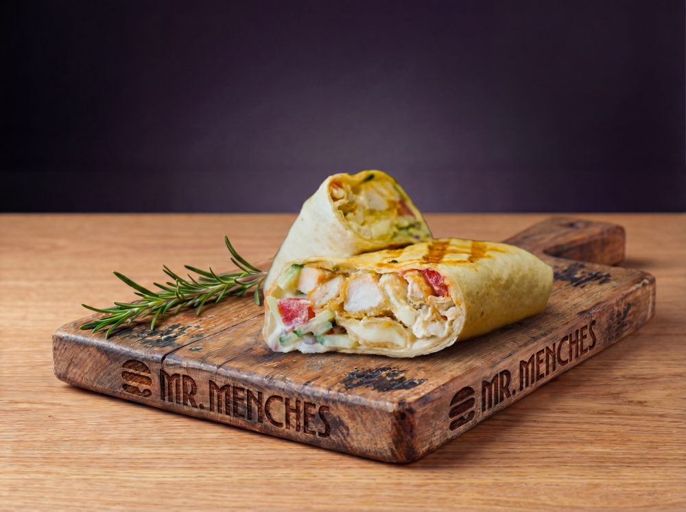 Тортилья, куриные стрипсы, свежий огурец, маринованный огурец, помидоры, красный лук, соус Фирменный чесночный