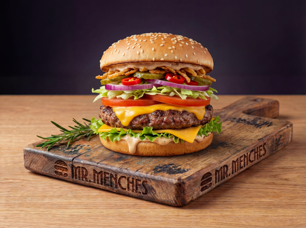 Бургер не для робких! Шрирача и перец чили - виновники торжества, которые прекрасно сочетаются с мраморной говядиной. Хрустящие маринованные огурчики, сочный помидор и лук смягчают остроту, а свежий айсберг, нежный фриллис и лук фри завершают этот насыщенный и сбалансированный вкус.