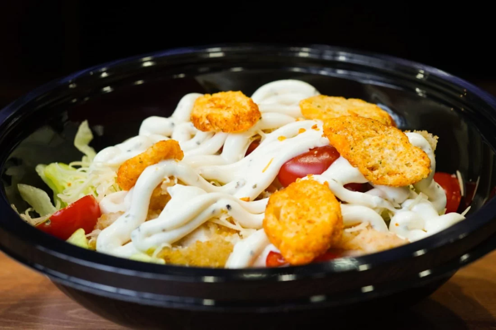 Классический салат Цезарь с курицей: свежие помидоры черри, хрустящие гренки, нежный пармезан и сочные куриные стрипсы, щедро заправленные ароматным соусом Цезарь. Вкусное и сытное блюдо для настоящих ценителей!
